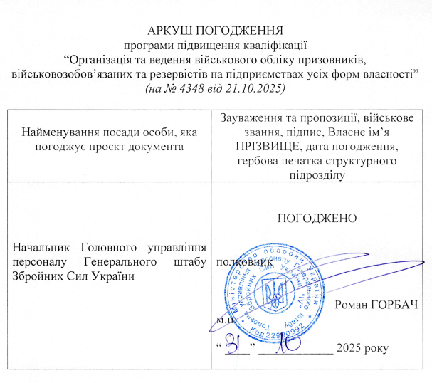 Забезпечити професійний розвиток з організації та ведення персонального та/або персонально-первинного військового обліку, оформлення бронювання військовозобов’язаних, фіксації, накопичення та аналізу інформації за військово-обліковими ознаками, здійснення заходів із забезпечення виконання встановлених правил військового обліку призовників, військовозобов’язаних та резервістів, що працюють в державних органах, органах місцевого самоврядування, підприємствах, установах та організаціях незалежно від підпорядкування та форм власності.Підготовка фахівців, які можуть правильно організовувати та вести військовий облік призовників, військовозобов'язаних і резервістів на підприємствах, в установах та організаціях. Навчання охоплює ознайомлення з вимогами сучасних нормативних документів, практичними аспектами обліку, а також мобілізаційної роботи, з акцентом на забезпечення кількісного та якісного укомплектування Збройних Сил та інших військових формувань. Саме тому редактори та консультанти кадрової системи KADREX спільно з МАУП розробили та погодили нову комплексну освітню програму підвищення кваліфікації, з урахуванням професійного стандарту «Інспектор з військового обліку» (код КП 3439)! Програму затверджено Генеральним штабом Збройних сил України !